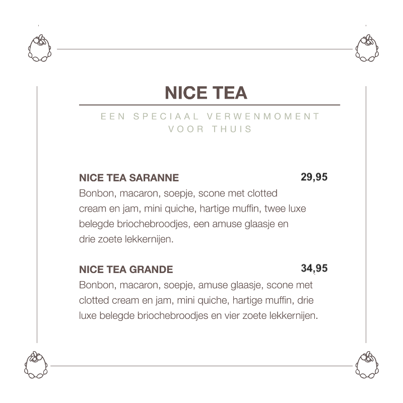 Geen tijd om in de winkel te lunchen? Of wil je graag de Nice Tea voor thuis bestellen? Saranne pakt de vers belegde scones en broodjes, smoothies of een krachtige espresso graag voor jou in om mee te nemen!